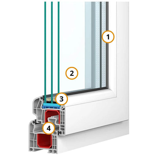 Das 5-Kammer-Profil der Klasse A bietet mit einer Einbautiefe von 70 mm und einer großen Verstärkungskammer hohe Stabilität und Wärmedämmung. - Verglasung: Je nach Wunsch kann die Balkontür mit Verglasungen bis zu einer Dicke von 36 mm ausgestattet werden. Optional ist eine 3-fach-Verglasung mit „Warmer Kante“ verfügbar, die für exzellente Energieeffizienz und einen niedrigen Uw-Wert sorgt.