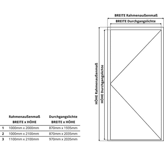 - Maße: Breite 1000 bis 1100 mm, Höhe 2000 bis 2100 mm, optional Seitenteile verfügbar