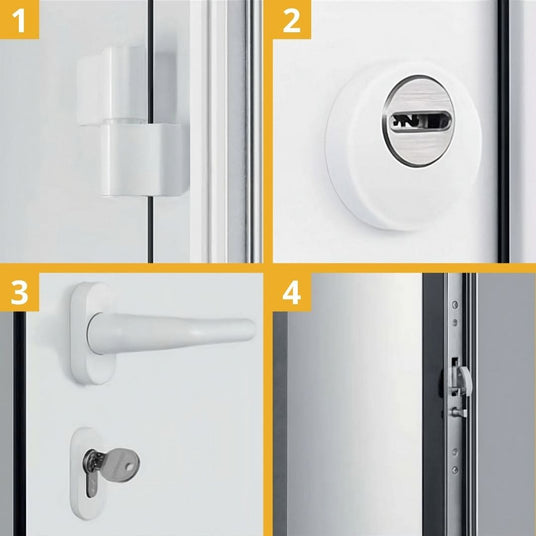 Der Profilzylinder ist mit einem Anti-Picking-System und Aufbohrschutz ausgestattet. Zudem bietet er eine Not- und Gefahrenfunktion, d. h. die Tür ist auch dann schließbar, wenn von innen ein Schlüssel steckt. Der manipulationssichere Schließzylinder ist nach DIN 18252 / DIN EN 1303 zertifiziert und wird inklusive 5 Wendeschlüsseln geliefert. Die patentierte Außenrosette schützt den Profilzylinder zusätzlich gegen Aufbohren und Abdrehen. Serienmäßig in Verkehrsweiß, RAL 9016, bzw. in Edelstahl bei farbigen Türen. - Aluminium-Innendrücker