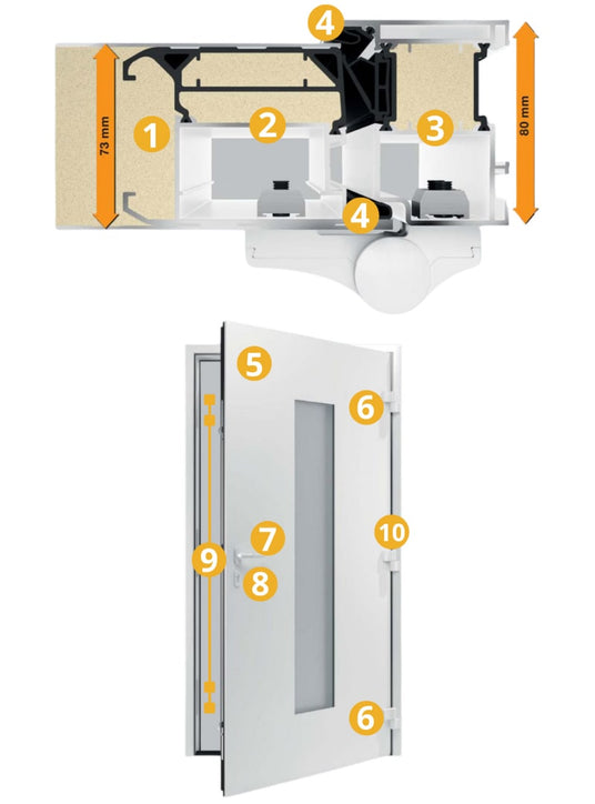 - Vollflächiger 73 mm Aluminium- Türflügel mit PU-Hartschaumfüllung und innenliegendem Flügelprofil